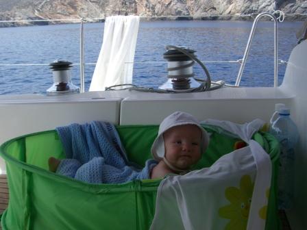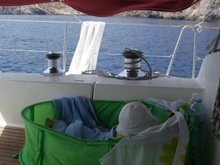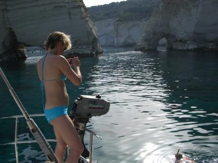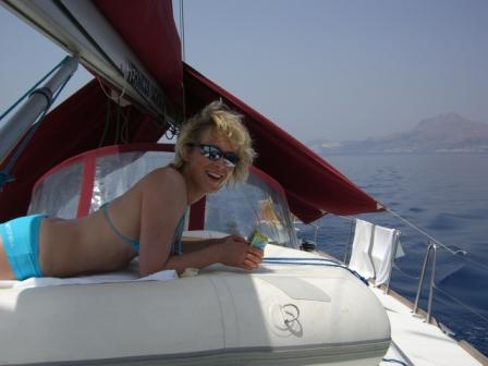 Martin har funnet hvilestilling ved baugen. Og forut skimtes Folegandros, der vi skal innta en gresk lunsj.
