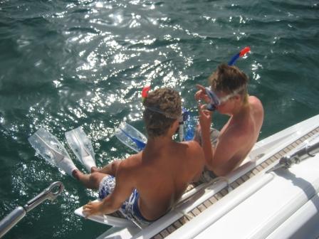 På svai ved en strand på øyas sørside. Vi svømmer inn og unner oss en bedre lunsj:)