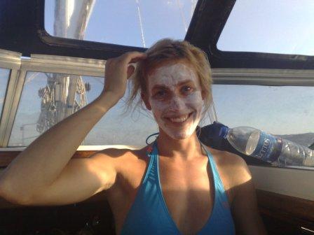 Snart klar til crew-bilde og landgang. Den fuktighetsgivende masken må bare trekke inn i huden først:)